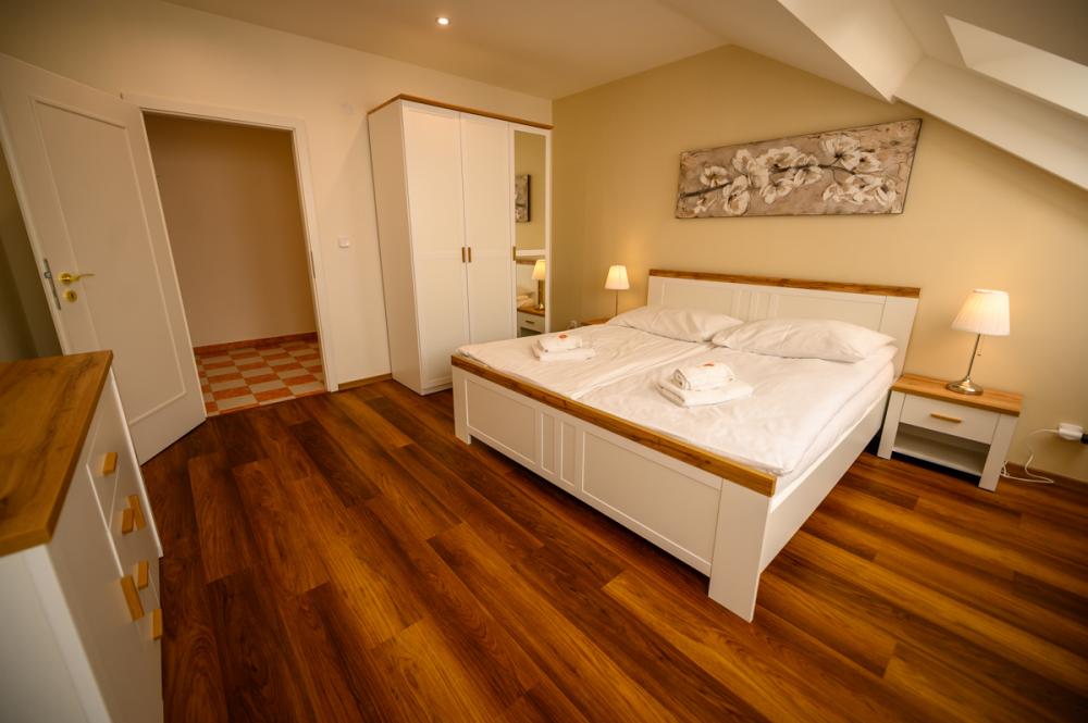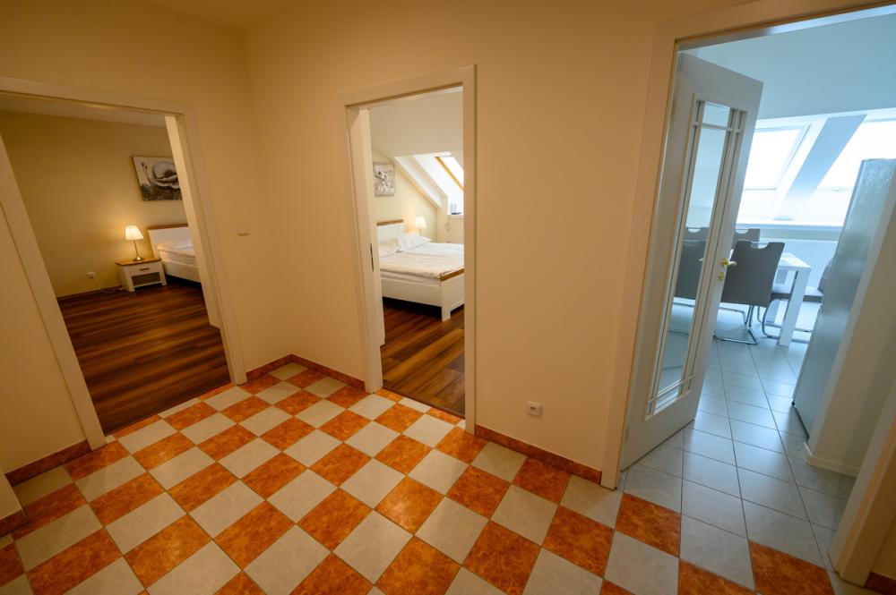 Vybavení: apartmán pro 4 osoby s možností dvou přistýlek - dvě dvoulůžkové ložnice, v jedné ložnici je manželská postel a v druhé ložnici je rozkládací gauč pro 2 osoby (šířka 140 cm), pevné lůžko a přistýlka, plně vybavená kuchyň (lednice, sporák, mikr. trouba, rychlovarná konvice, kávovar …), koupelna s vanou, WC