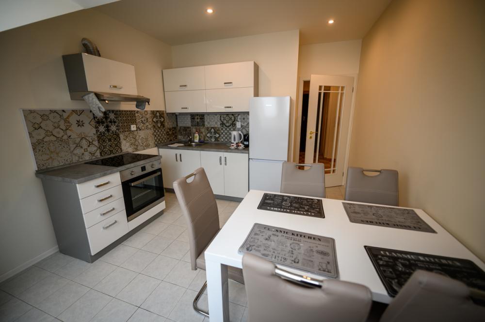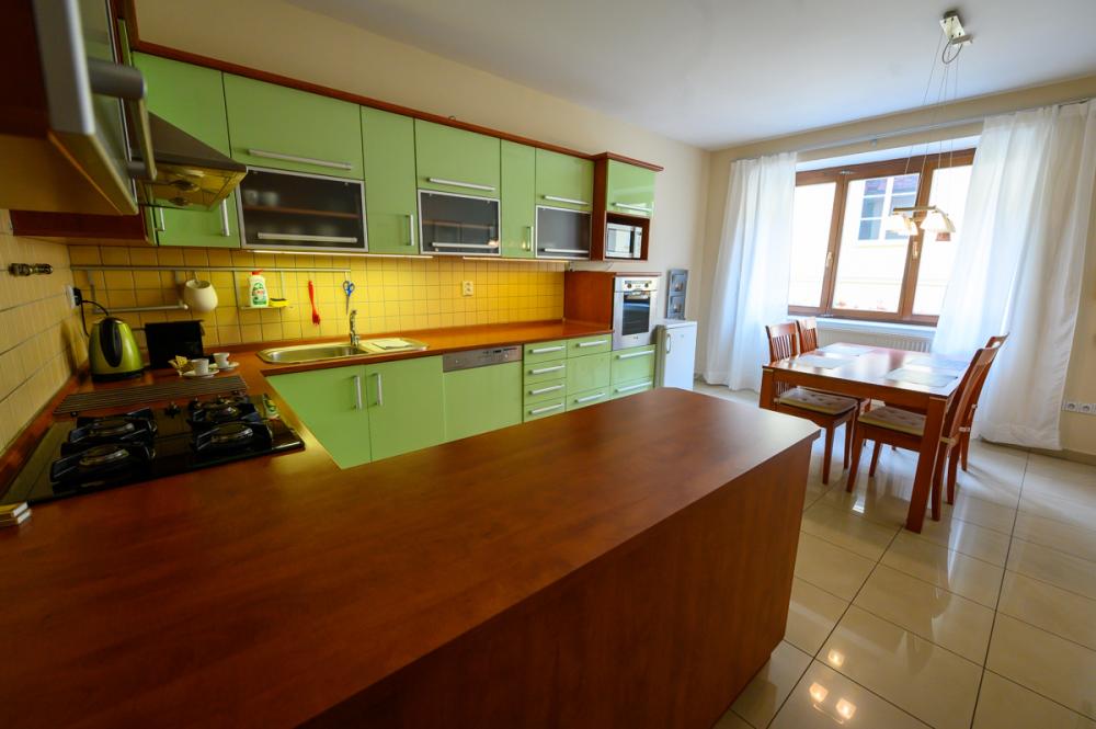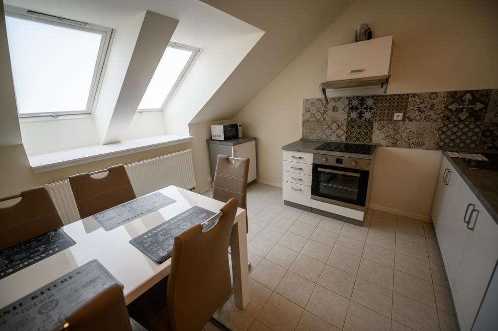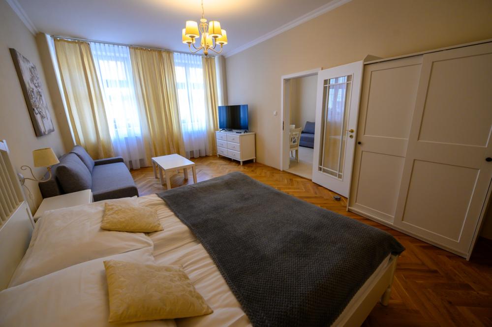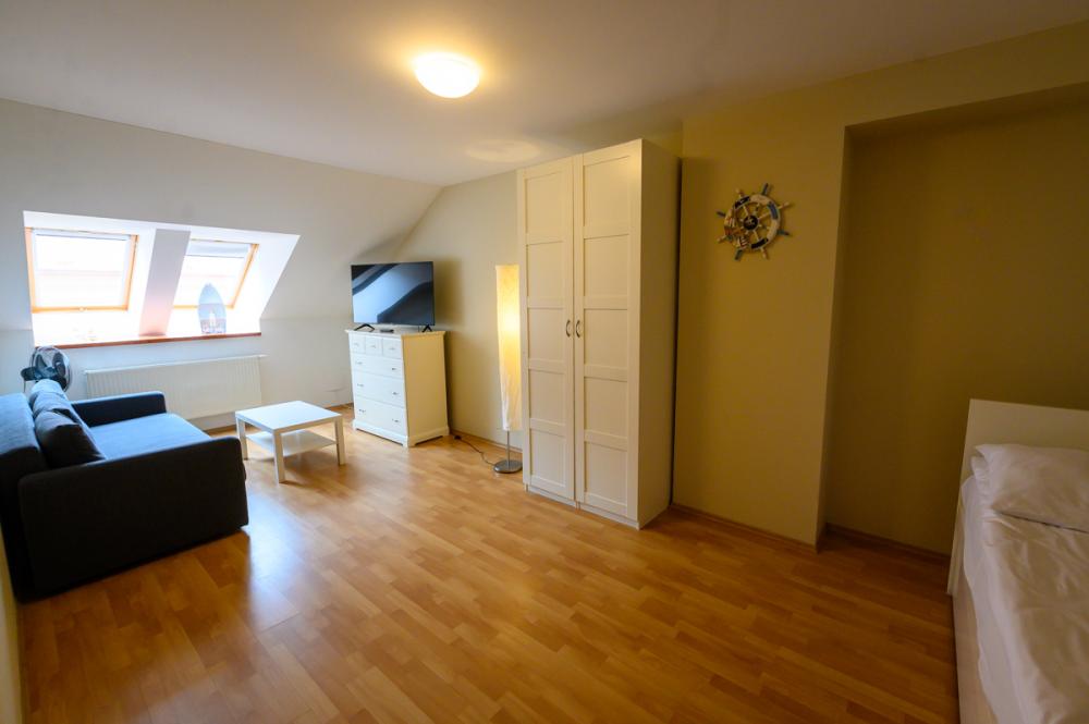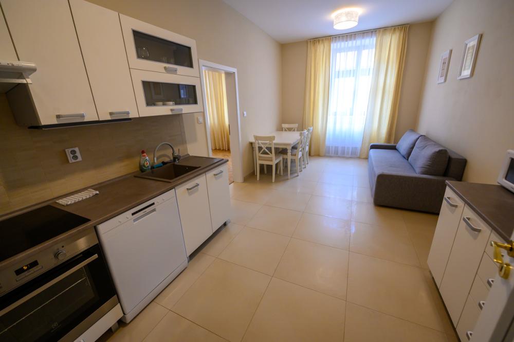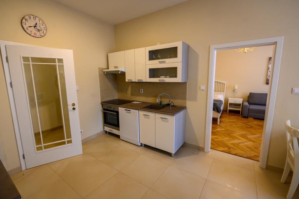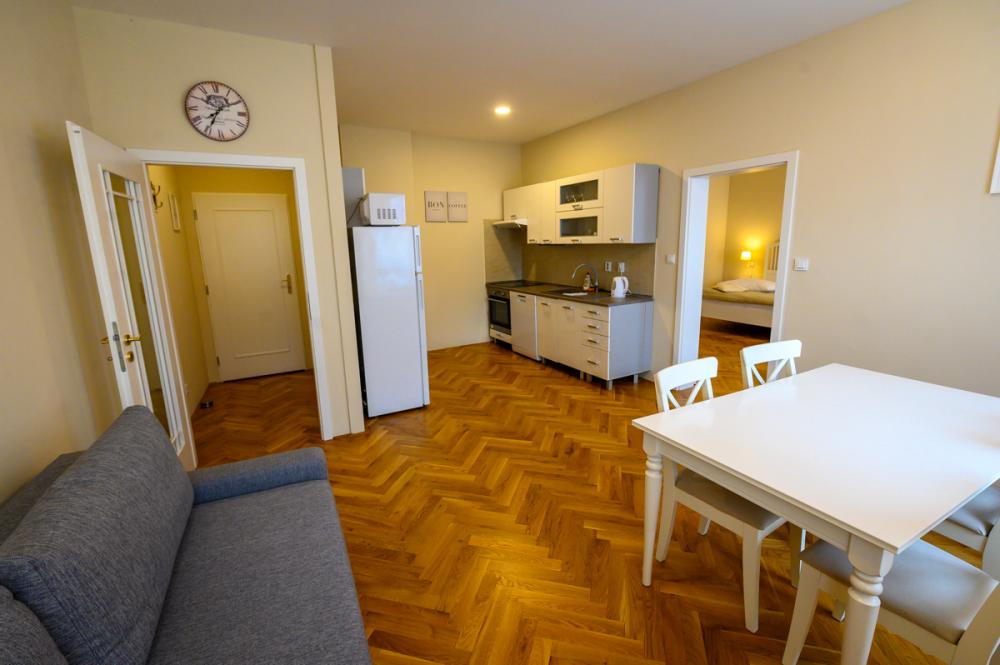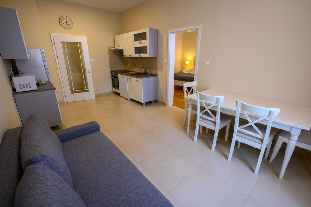 Vybavení: apartmán pro 4 osoby s možností dvou přistýlek - ložnice s manželskou postelí a s rozkládacím gaučem pro 2 osoby (šířka 140 cm) + možnost 2 přistýlek, plně vybavená kuchyň (lednice, sporák, myčka, mikr. trouba, rychlovarná konvice, kávovar…), koupelna se sprchou, WC