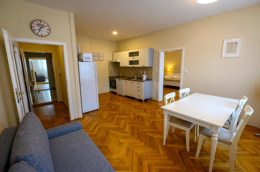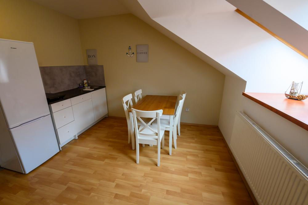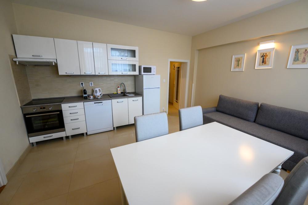 Vybavení: apartmán pro 5 osob, ložnice s manželským lůžkem a rozkládacím gaučem (šířka 140 cm). Plně vybavená kuchyň - myčka, lednice, mikrovlnka, trouba - rozkládací gauč (šířka 140 cm). Koupelna se sprchovým koutem.